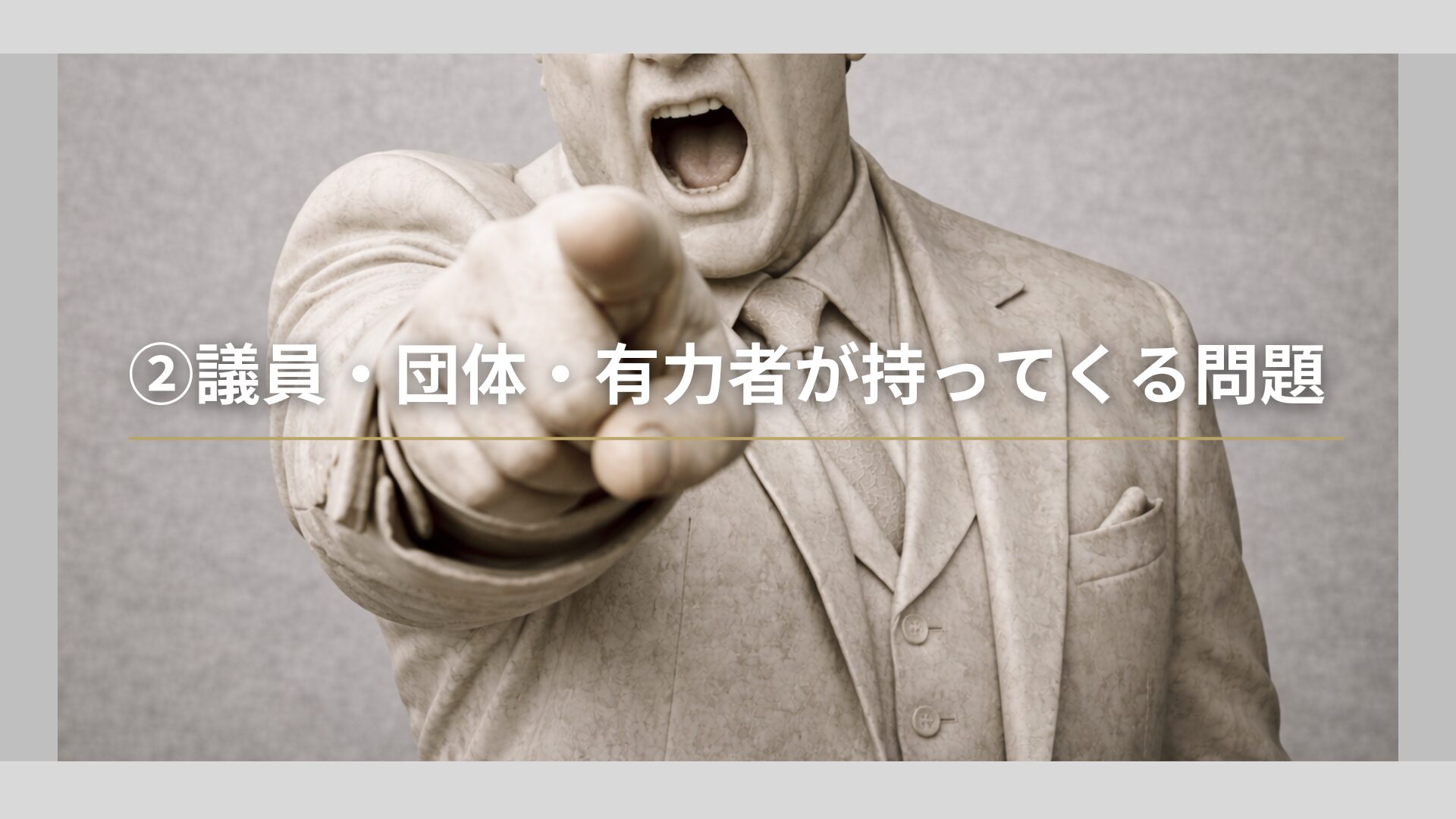 普通なら「通常のケース」で済む話ですが、議員が持ってきた瞬間に、その案件は自動的に 「行政課題」に格上げされます。