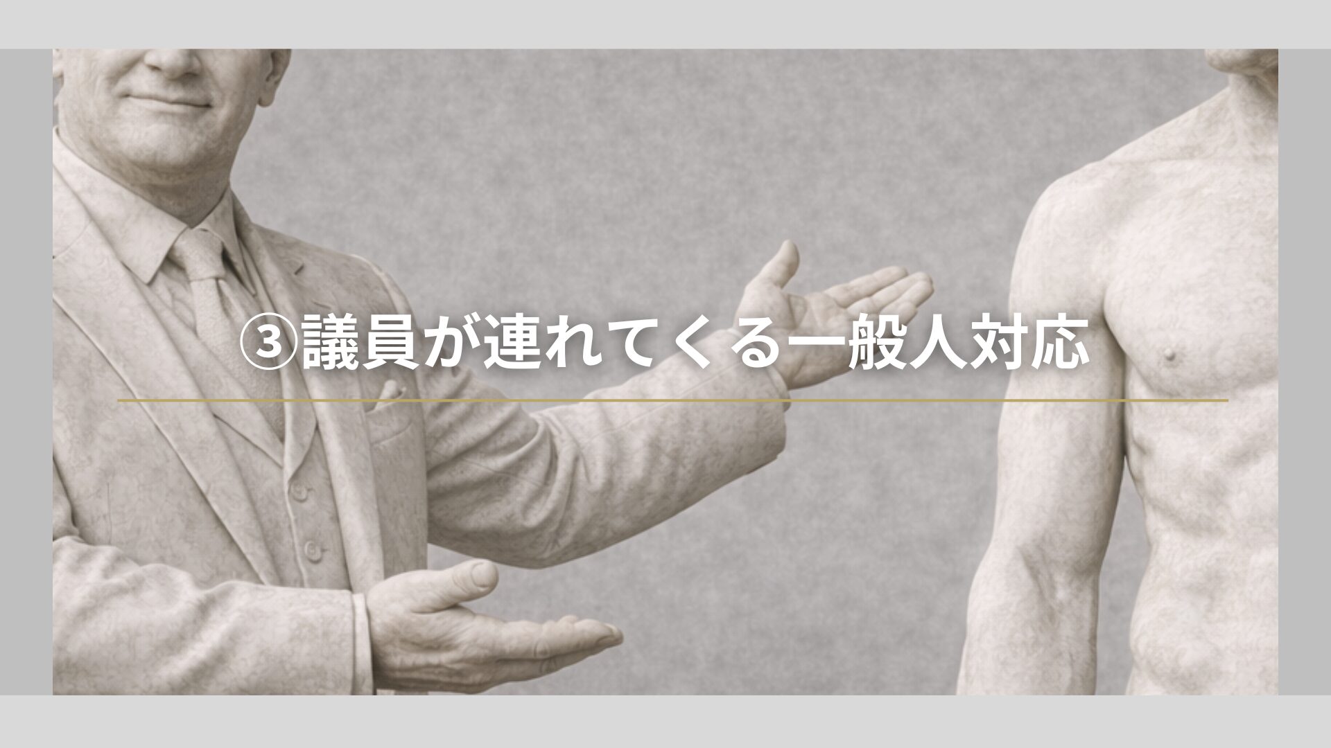 これも公務員あるあるなんですが、議員が一般人を連れてくるパターンがあります。
